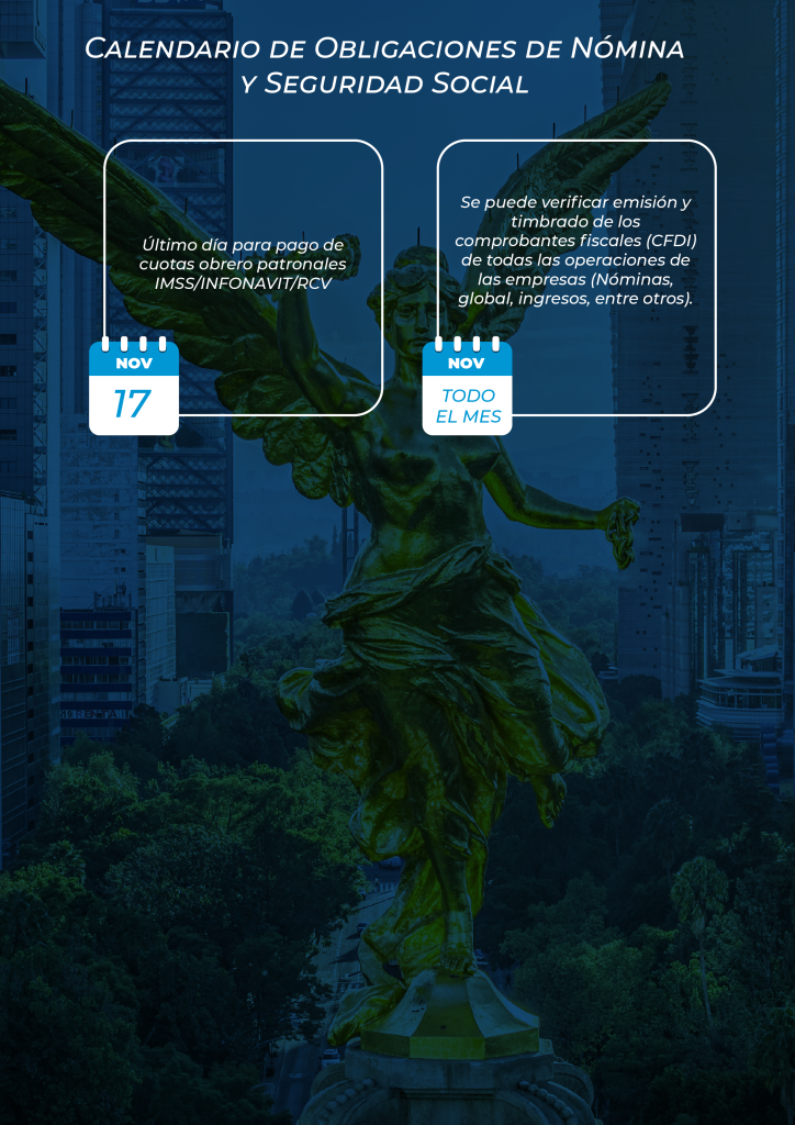 Nuestros especialistas del área de Nóminas y Auditoría para Seguridad Social e INFONAVIT, Contribuciones Locales se encuentran a sus órdenes para ayudarle a resolver dudas o cumplir con las disposiciones señaladas en el presente calendario.