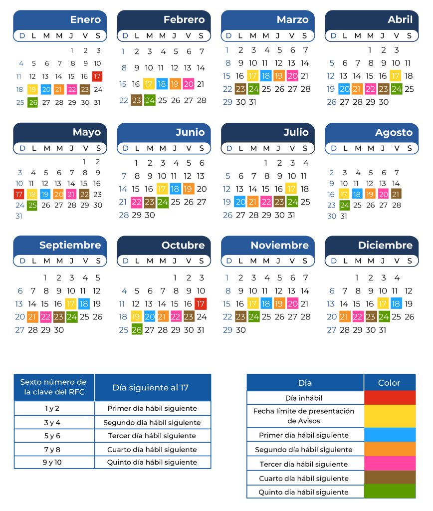 Esta calendarización aplica sin perjuicio de la facilidad administrativa vigente, la cual permite presentar dichos avisos con posterioridad al día 17 del mes correspondiente, o bien, el día hábil inmediato siguiente, cuando el día 17 sea inhábil, siempre que se respete el día asignado conforme al RFC.