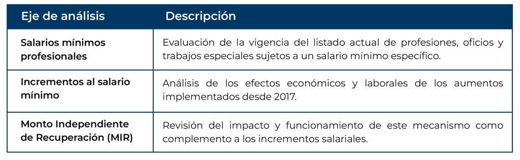 La Comisión Consultiva tendrá como eje central la revisión de tres componentes estratégicos de la política salarial nacional, los cuales se detallan a continuación: