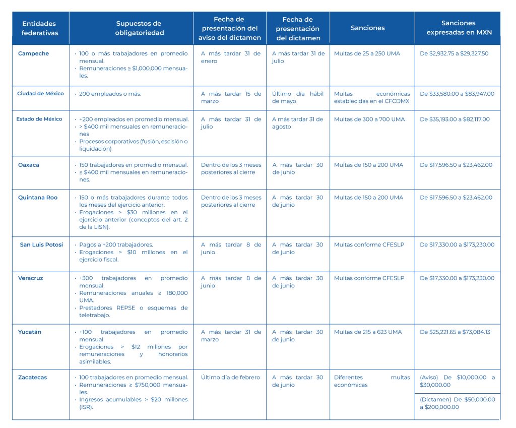 A continuación, se presentan los supuestos y plazos de vencimiento de los estados con dictamen estatal obligatorio: