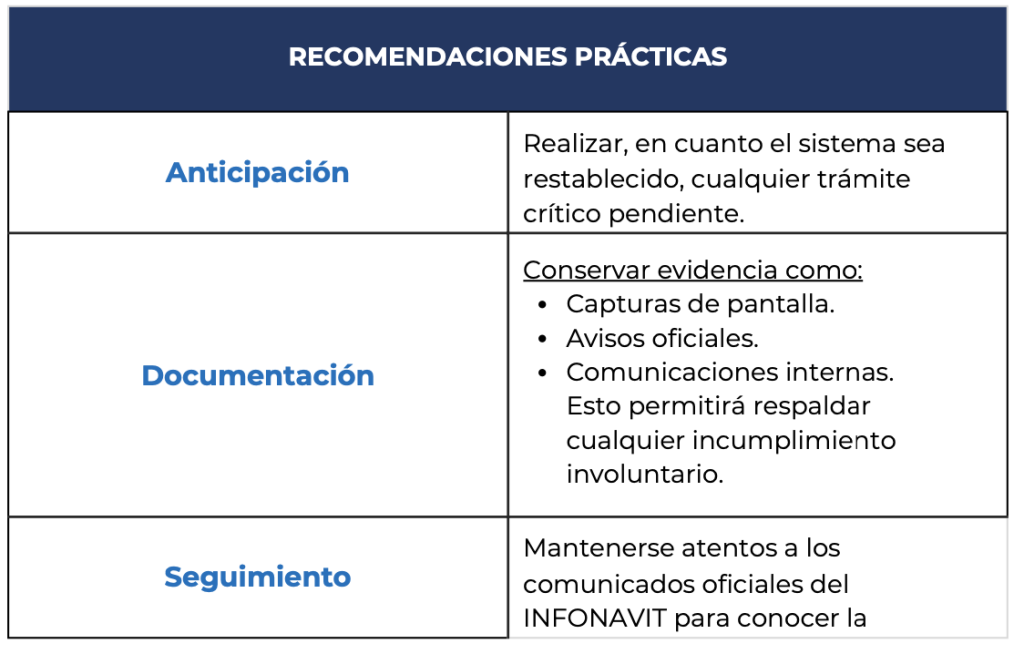 En términos prácticos, esta situación limita temporalmente la capacidad de las empresas para cumplir en tiempo real con diversas obligaciones ante el INFONAVIT.